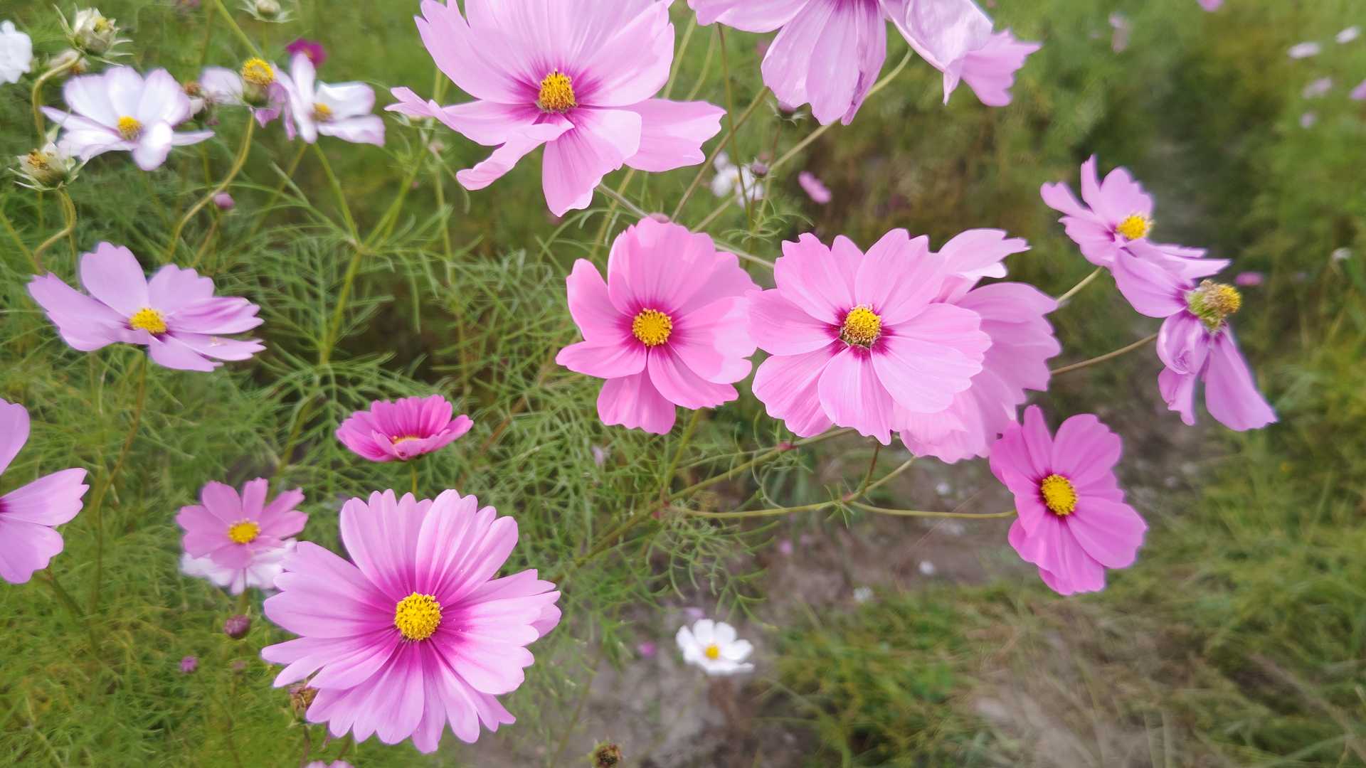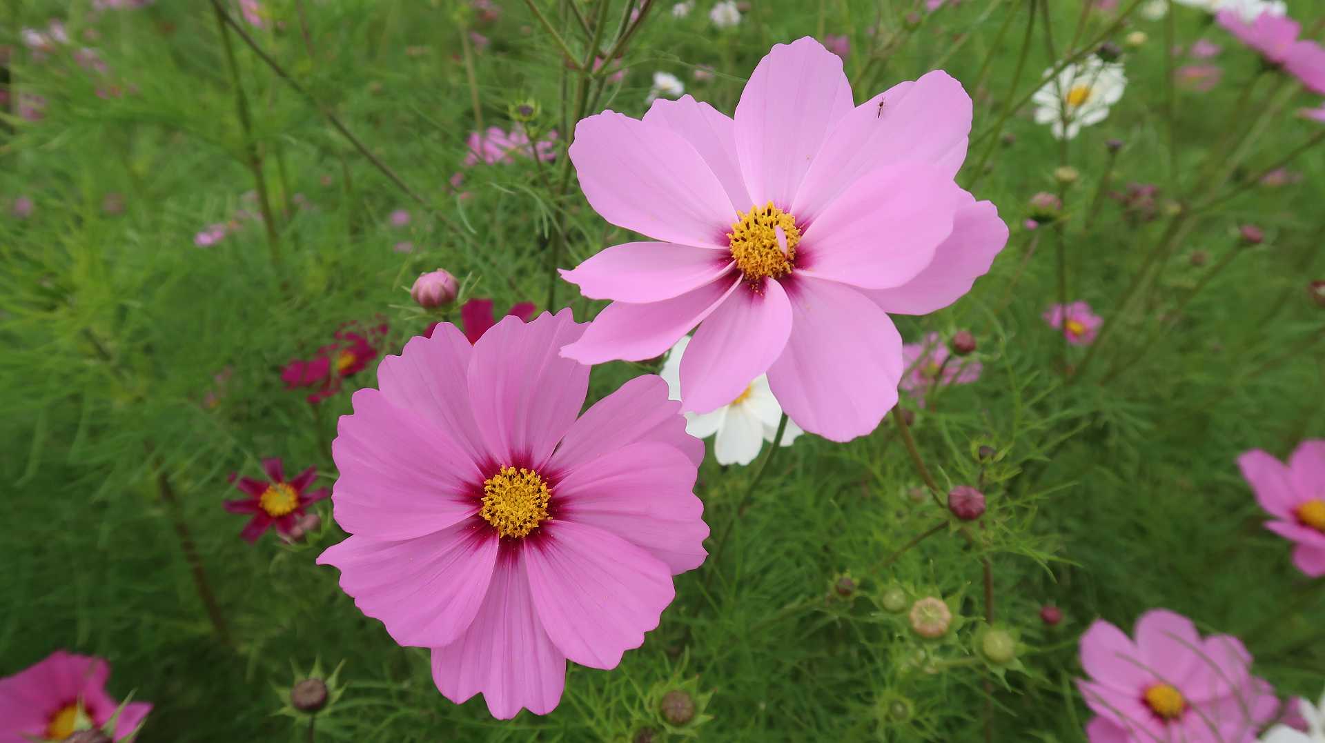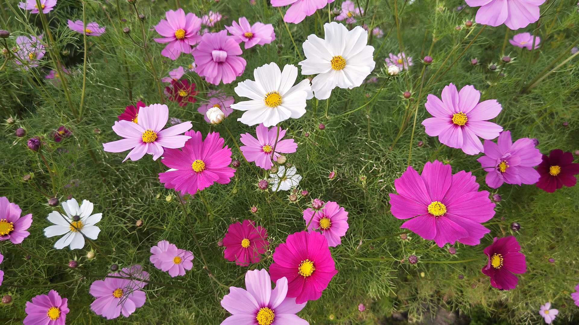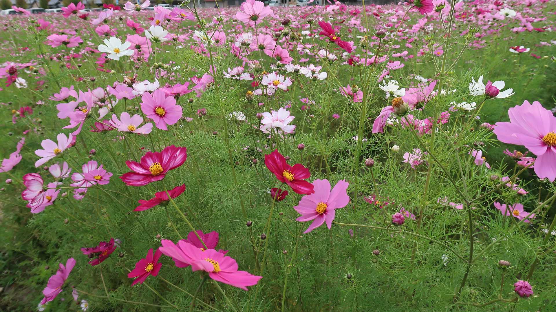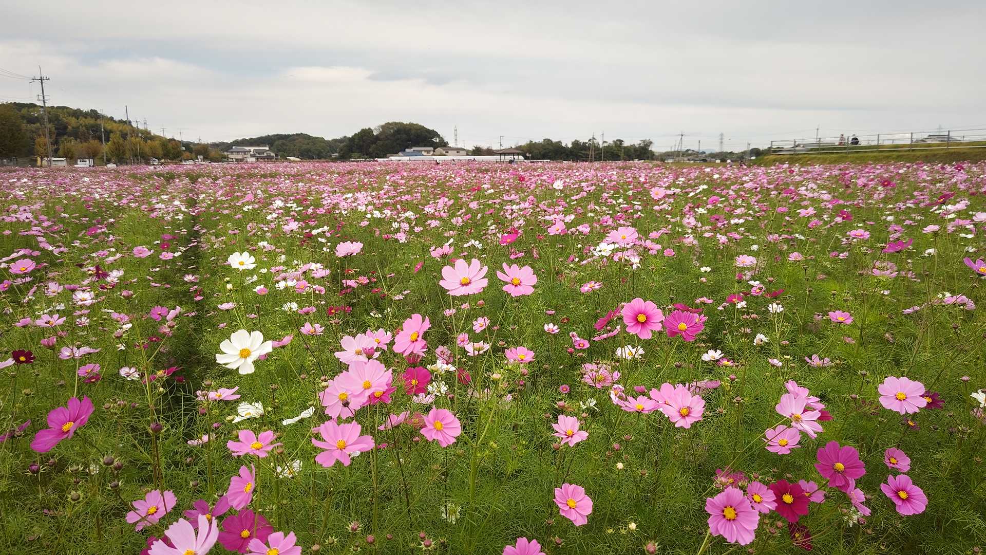 中宮寺跡周辺はコスモス畑が広がり、開花時期には多くの人が訪れています。