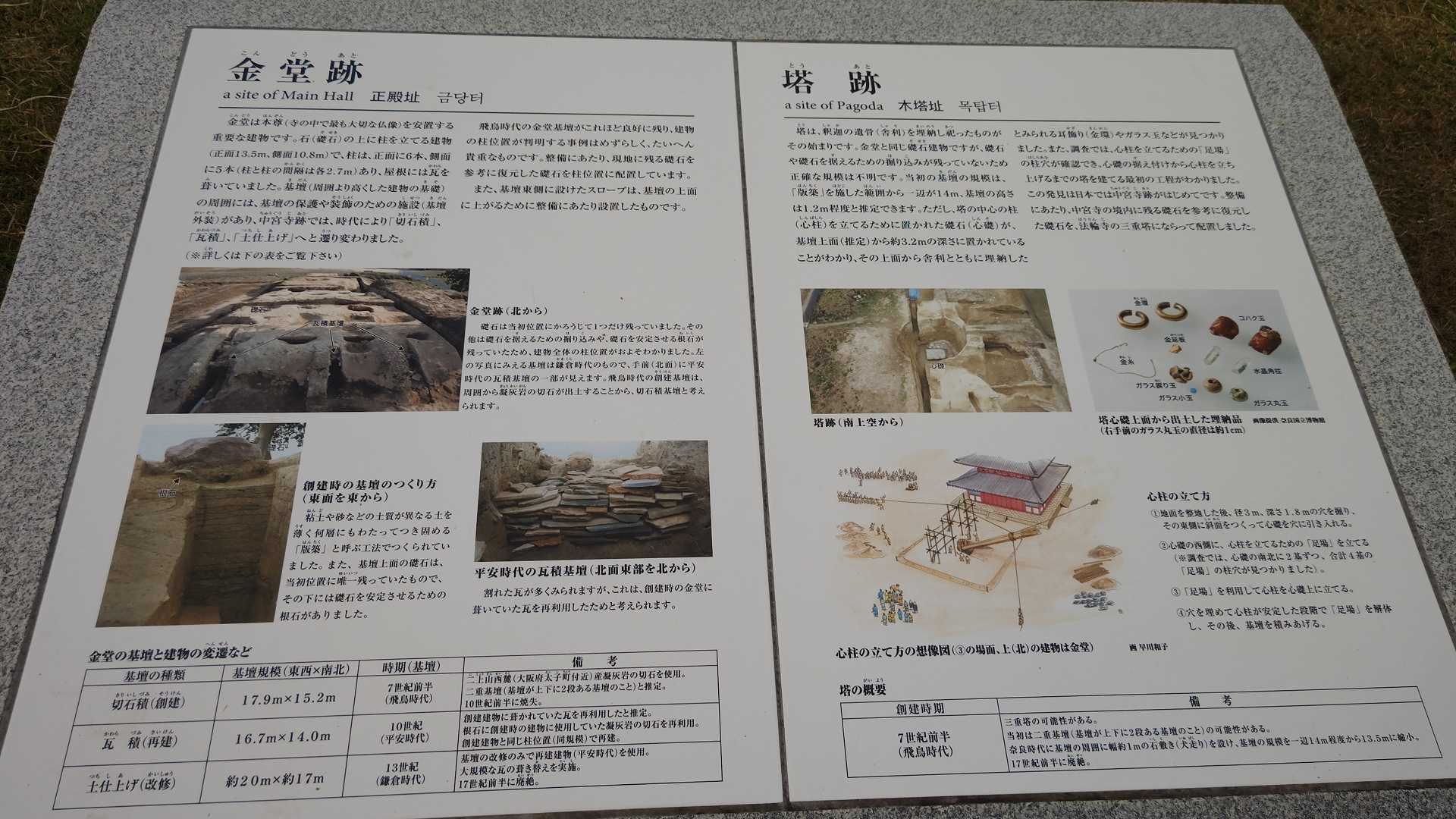 塔基壇は上面の削平が著しく、側柱礎石を抜き取った溝の一部と、花崗岩製の地下心礎を検出したにとどまる。基壇規模は、一辺約13メートルで、塔の平面形式は不明であるが、一辺6・8メートル前後と推定される、地下2・5メートルに遺存する心礎の上面には、心柱の根元を固定した根巻粘土が遺存し、その内側から金環、金糸片、金延板小塊、琥珀棗玉、ガラス捩玉、丸玉、水晶角柱などの埋納物が発見されている。これらは、心礎に舎利孔などの細工がみられないことから、心柱の根元に穿った小孔内に納められていたものと考えられる。塔と金堂の基壇は5・2メートルと近接して南北に並び、往時には軒を接するような状況であったと思われる。現在のところ、講堂や中門、回廊などの存在は明確になっていない。