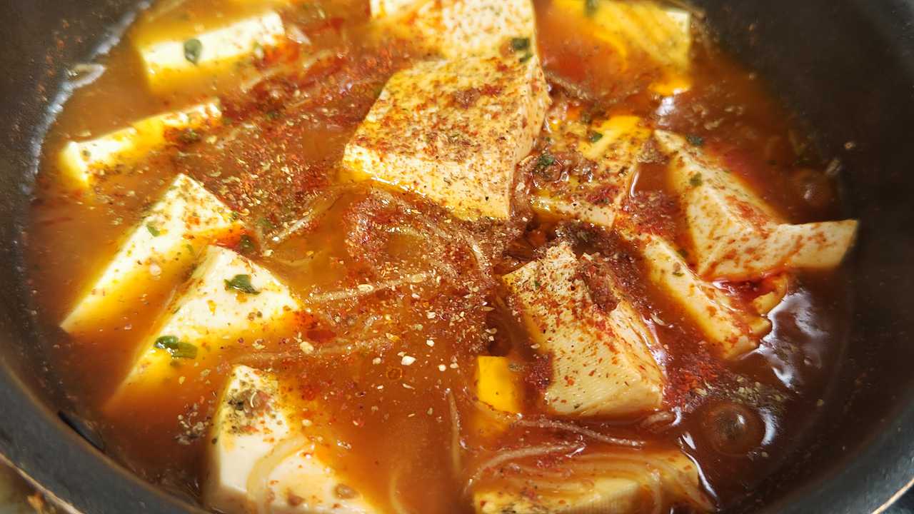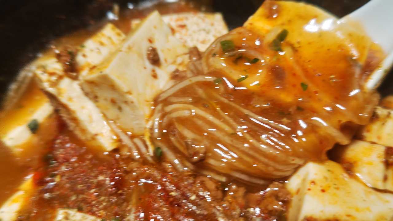 朝っぱらから、春雨と豆腐の麻婆に、唐辛子や花椒たっぷり。。。
