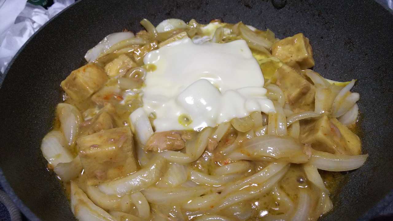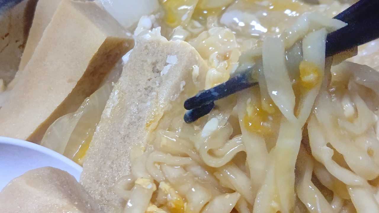 もつなべのスープで、高野豆腐と、インスタントのうどんと玉子でいただきました!