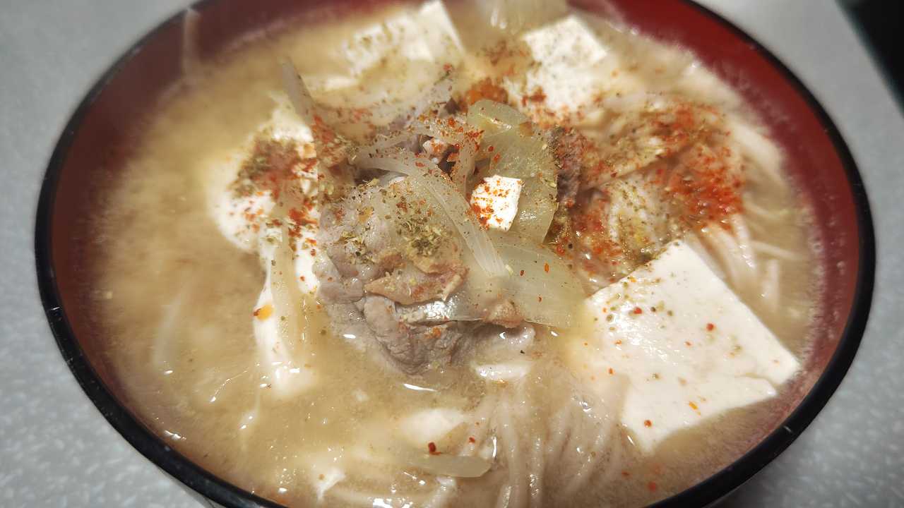 豚汁の素2パックに、豆腐半丁、玉ねぎ半個、豚肉入れて
