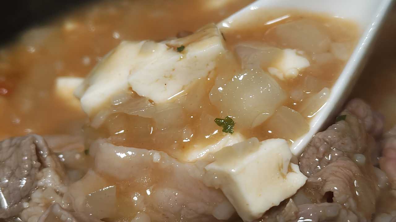 スープリゾットの海老ビスク2袋と、豆腐半丁と玉ねぎ半分をみじん切り、豚肉も入れて