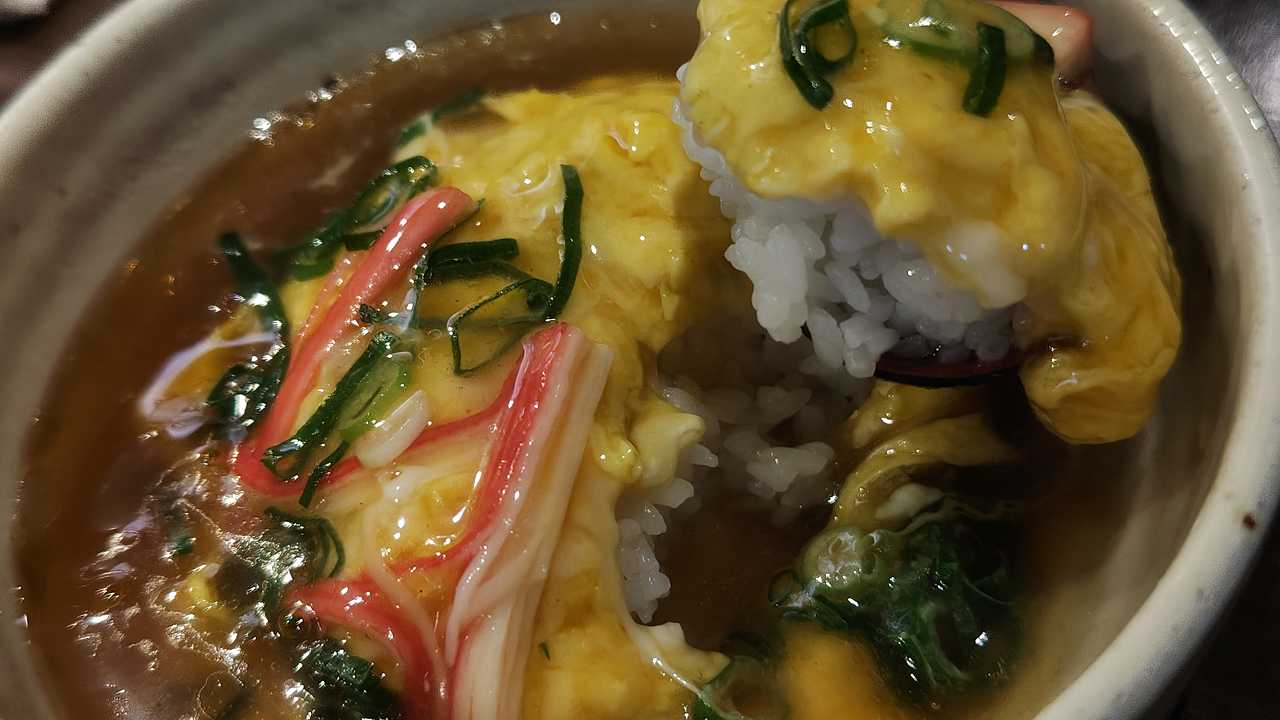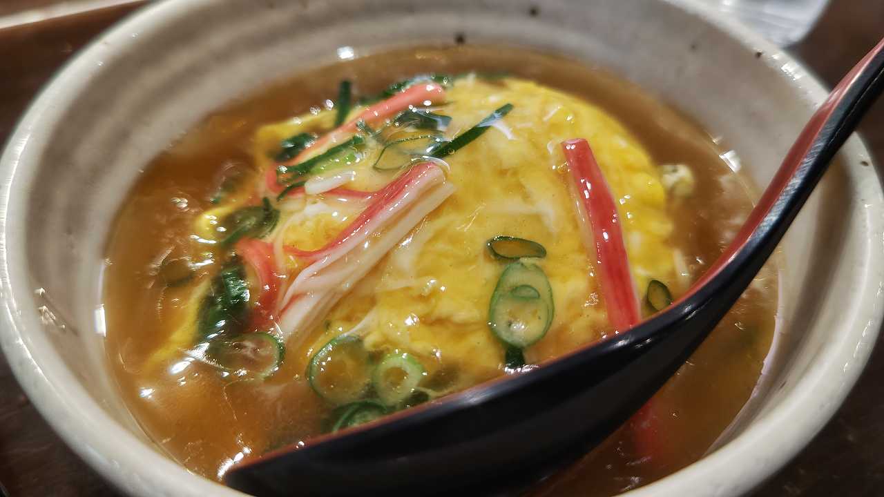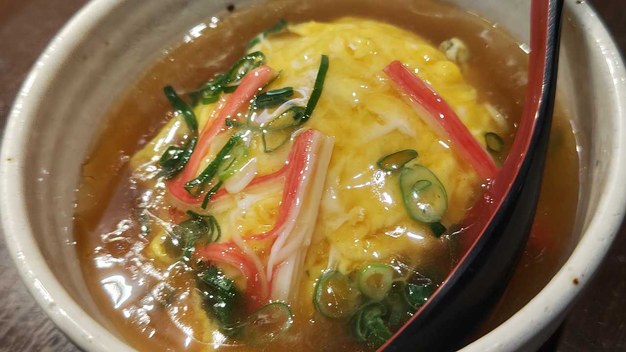 天津飯は、ラーメン屋のって感じのスープの感じ、少し、ショウガなのか、芝麻醤入ってる、いちりんラーメンのような感じの味がして、なかなか美味しい。玉子もホワホワです。