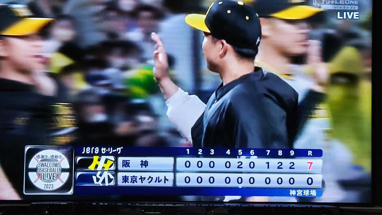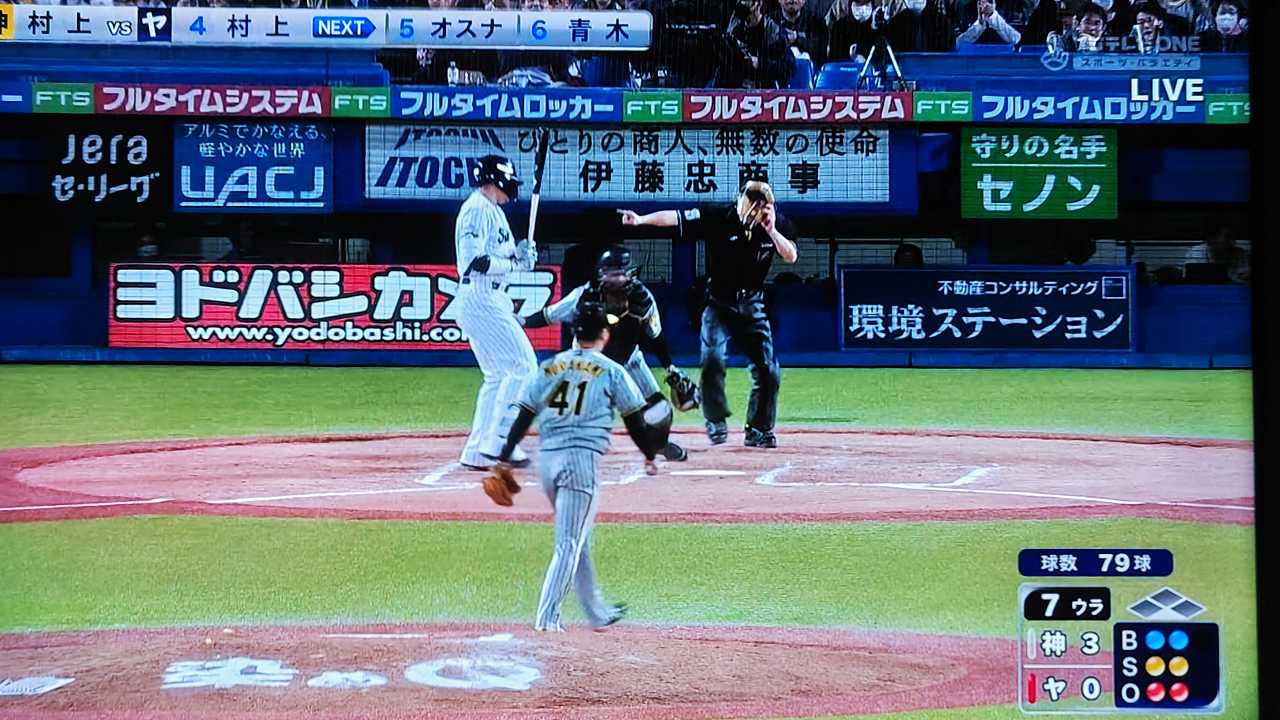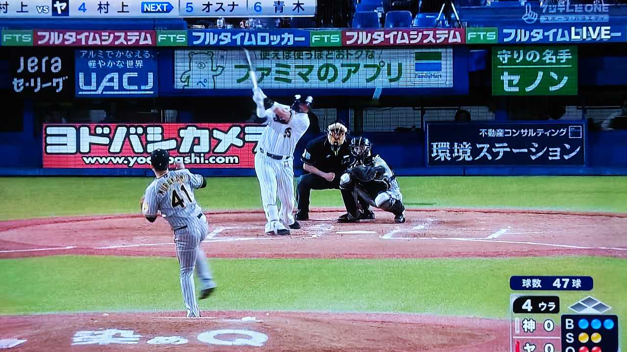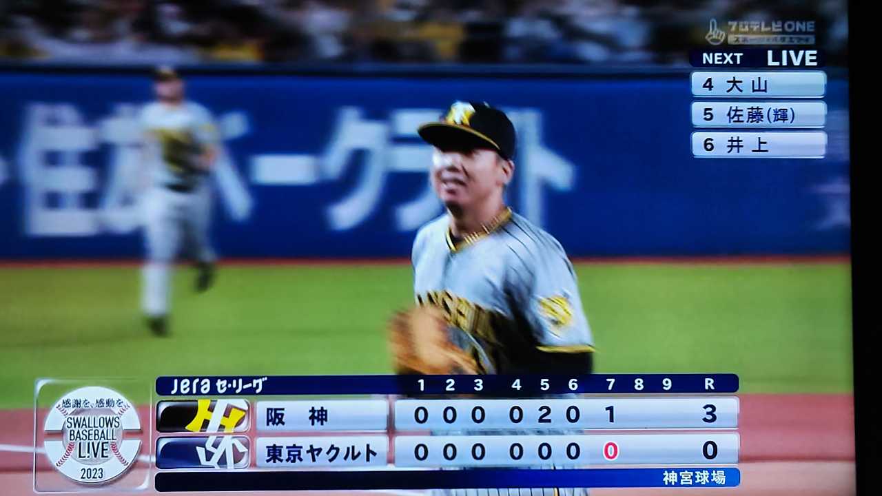 虎の村神様!!ヤクルトの村神様を三タコ三振ひとつに打ち取って、最後ピンチも川端山田の代打攻勢を外野フライ二つで、25イニング無失点!!!