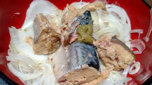 今日も新玉ねぎスライスに、鯖缶柚子胡椒味に、柚子胡椒トッピングで一杯いただきます