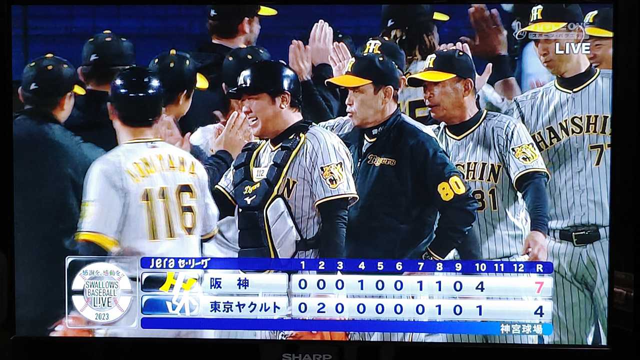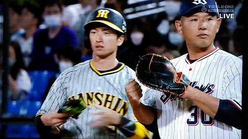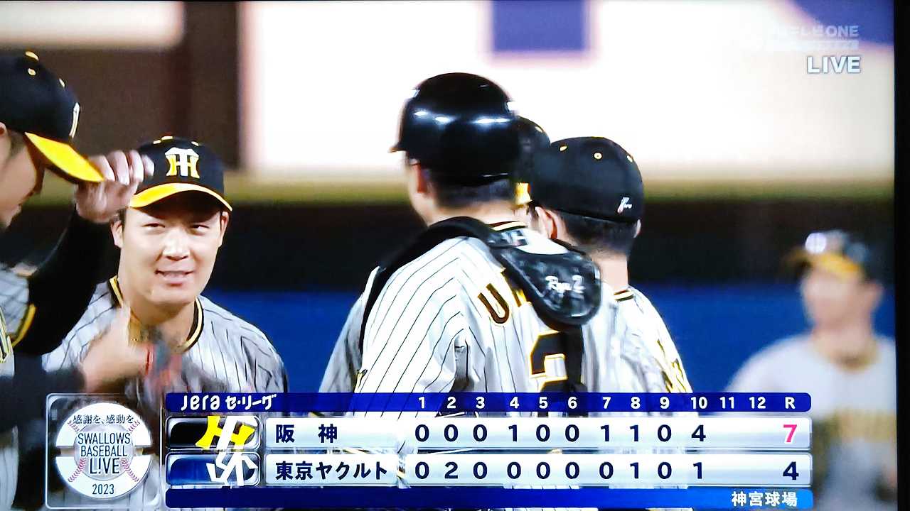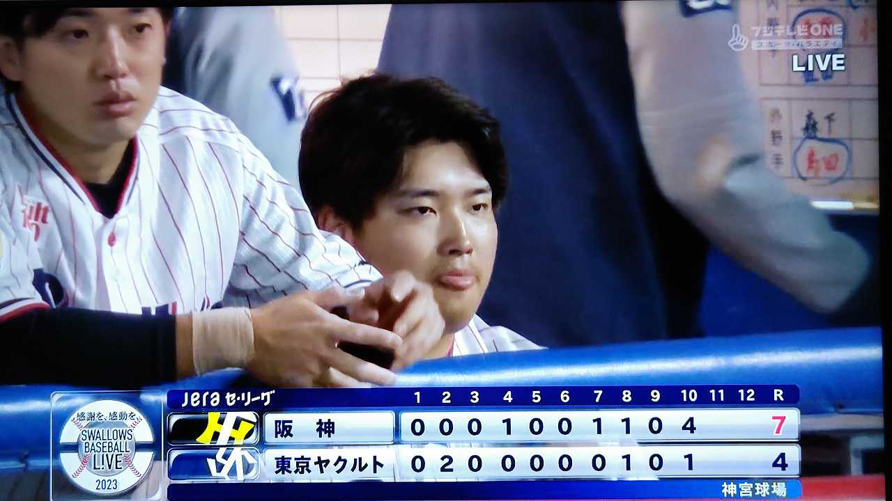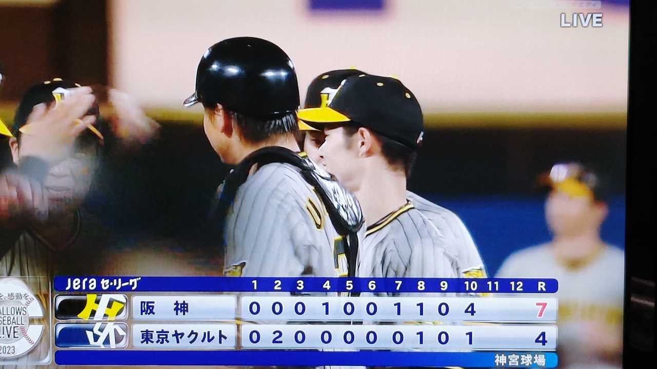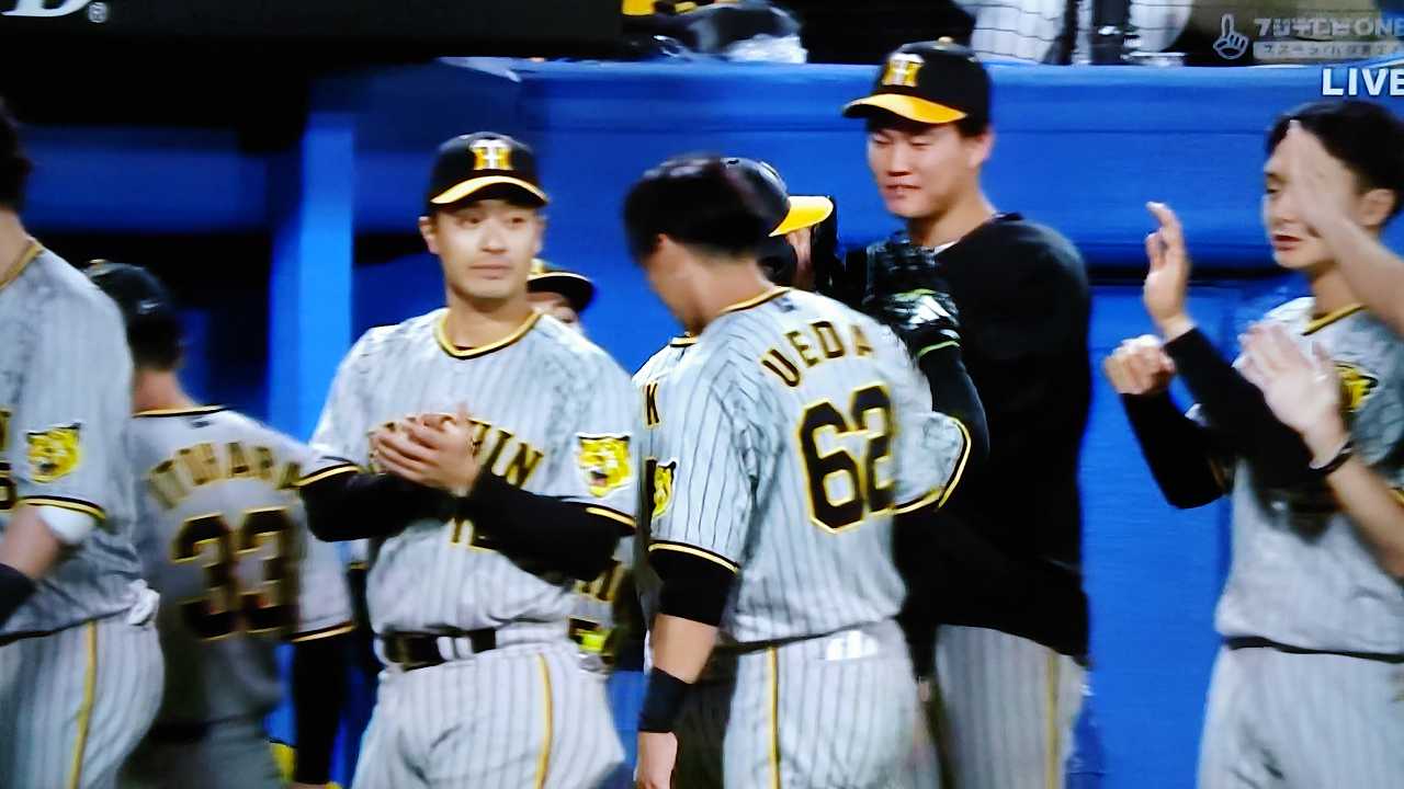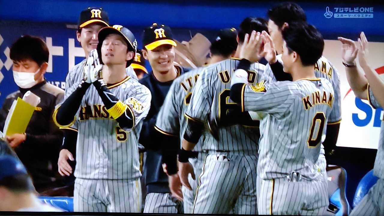 その後に同点とされるも延長10回、2死から打線がつながった。近本の安打、中野の四球、ノイジーの安打で満塁とし、大山の押し出し四球で勝ち越しに成功。なおも続く2死満塁で佐藤輝が走者一掃の適時2塁打を放った。