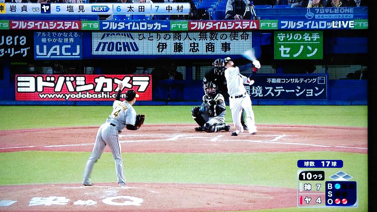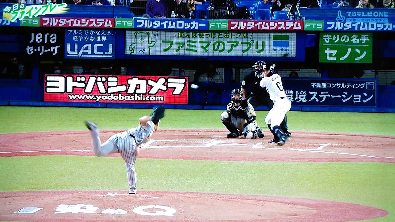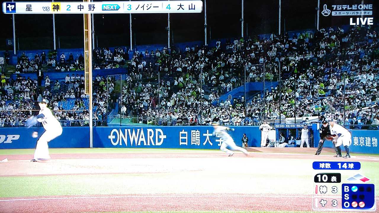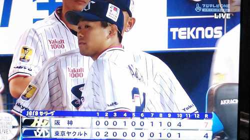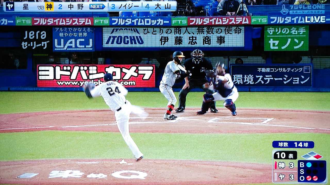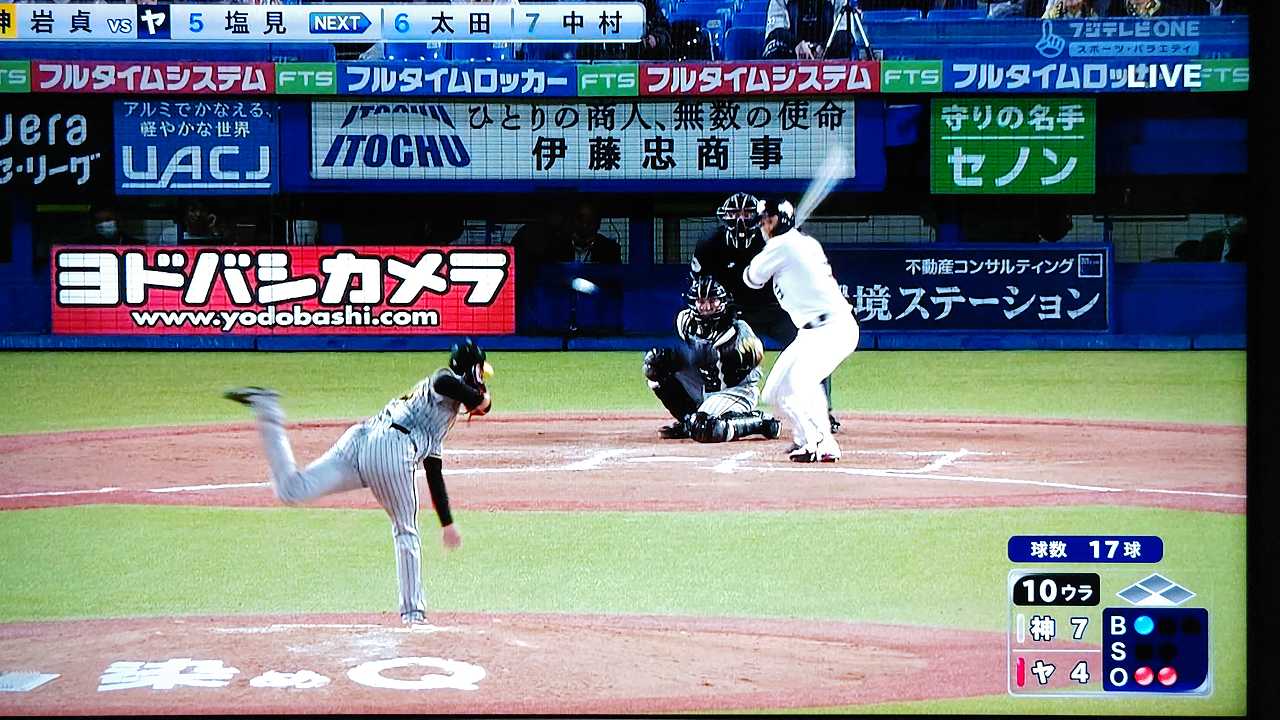 村上さまに特大のホームランは打たれましたが、まったく勢いは繋がらず、塩見の三塁線の抜いたかのあたりを、サトテルが、超ファイルプレー!!