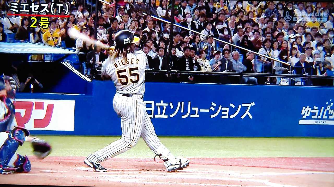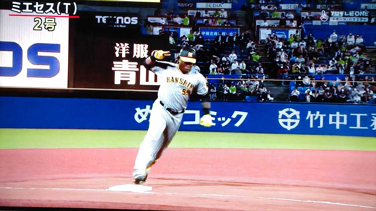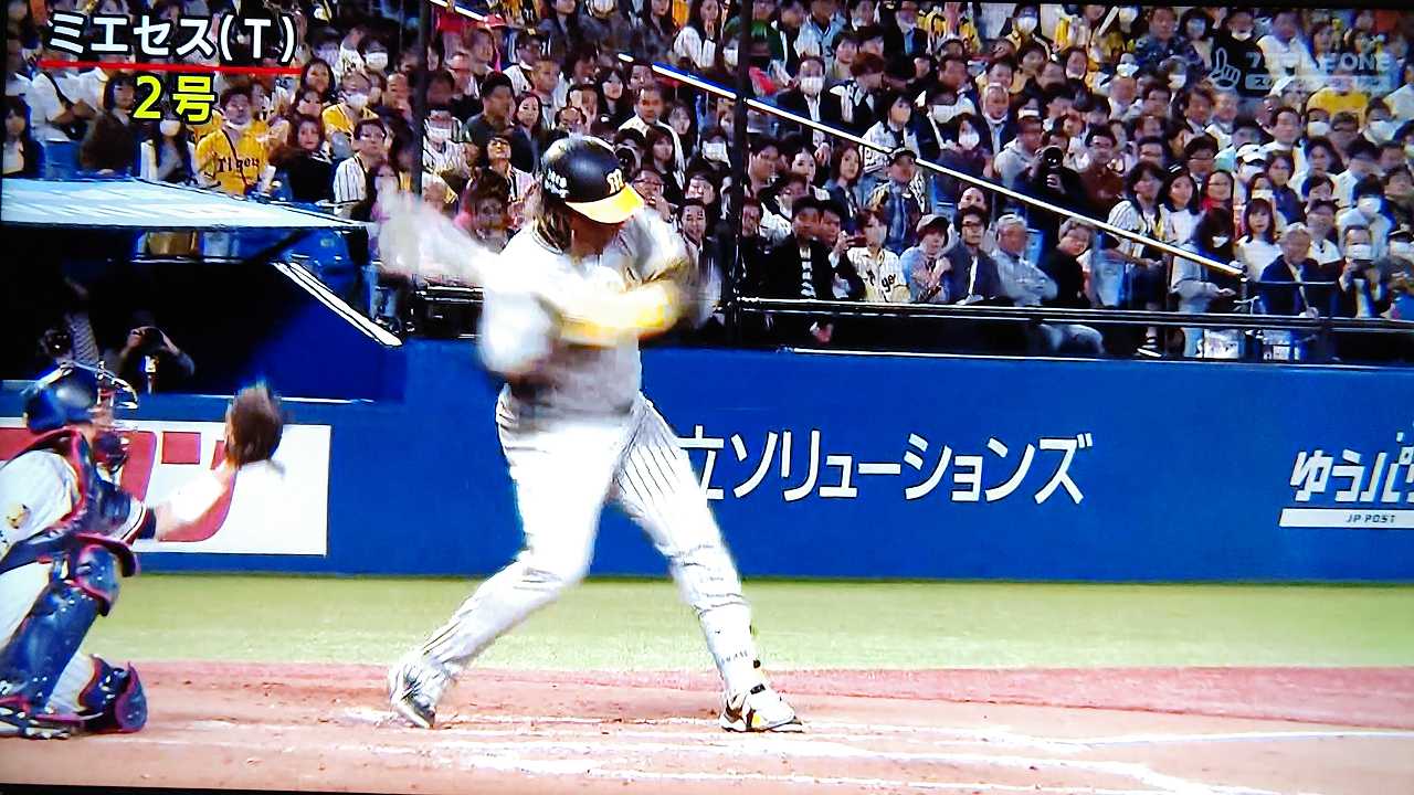 ビッグプレーはまだまだ続く。6回1死1、2塁のピンチではショートの木浪がセンター前に抜けそうな打球に飛びつきそのまま2塁ベースへトス。ファインプレーで失点を防いだ。するとその直後、7回にミエセスがスタメン起用に応えた。高めの球に対し鋭いスイングが一閃。来日2号は左中間への豪快な同点アーチとなった。