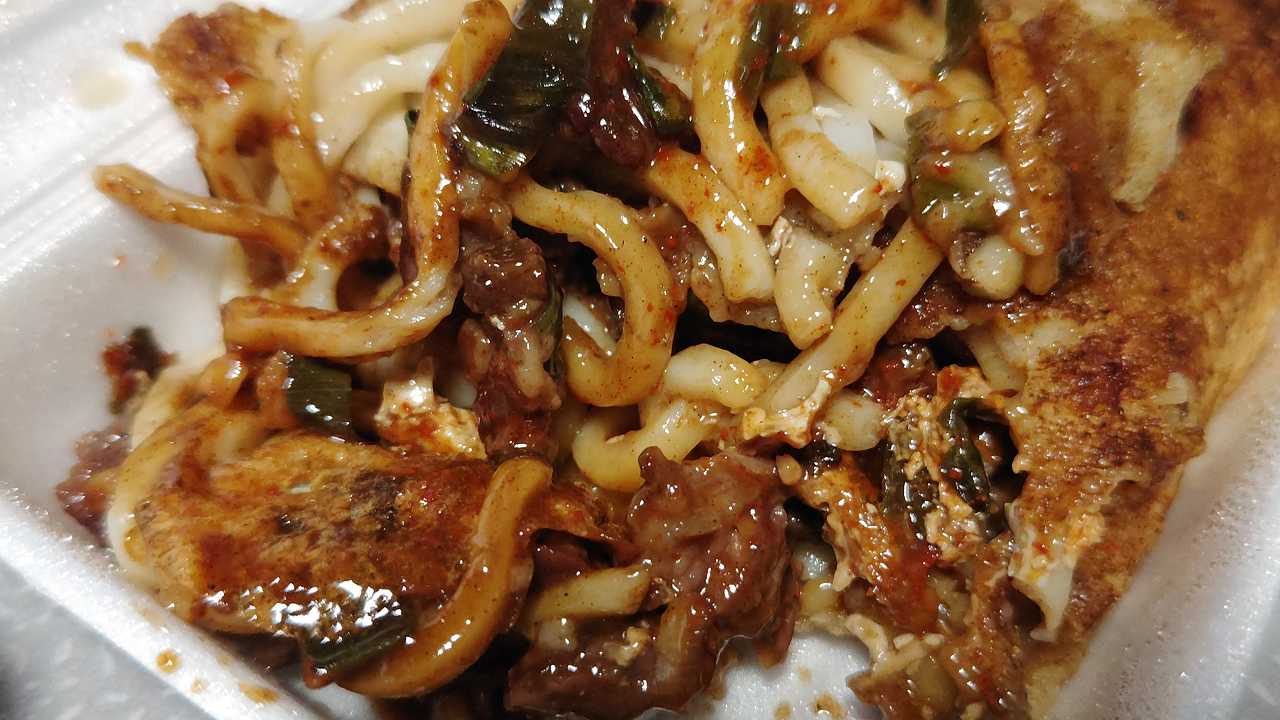 Feb 22, 2021 八幡市 レインボー 皮ひき焼きうどん1.5玉 スジ増量 辛口ソース 玉子一味トッピング #一銭洋食 #ネギ焼き #八幡市 #八幡市グルメ