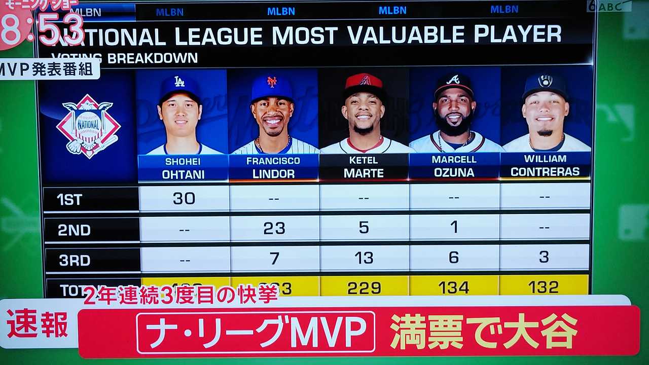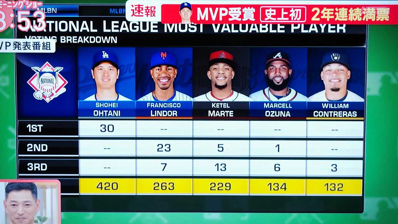 2年連続満票MVP