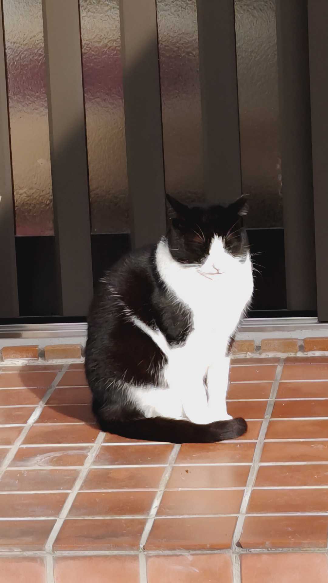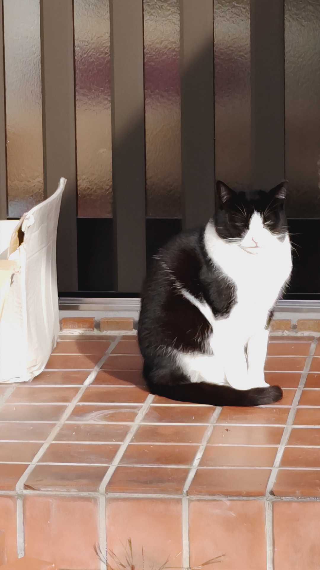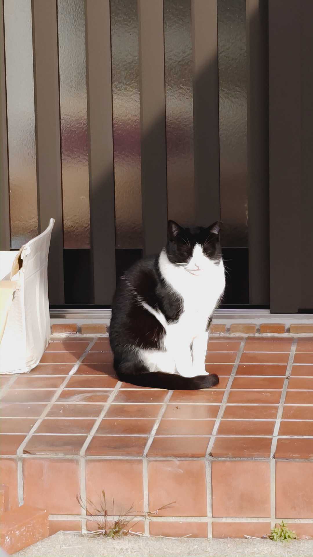 朝、寒いなか、ピンポイントで日が辺るとこで!直立の日向ぼっこと
