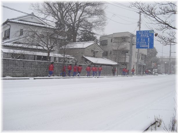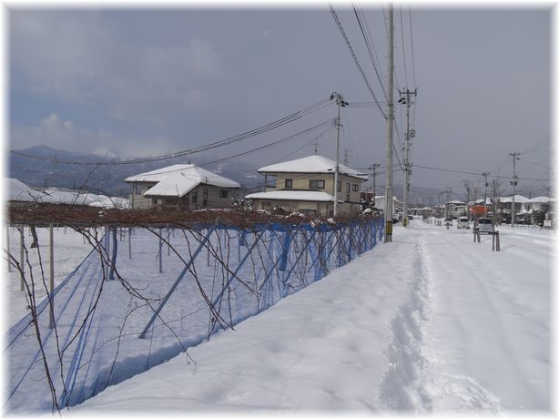 私がウォーキングをスタートさせたのは浦安ファミリーが帰った翌日の4日からでした雪が降っていましたが、デジカメとウォークマンが濡れないようにと注意しながら家を出ました 私のようにただ歩くだけの人には会いませんでしたが犬を散歩させている方やそれに高校のサッカー部でしょうか元気に走っていく学生さん達を見かけました戻りまして庭に行きますと採り残されて垂れ下がった隣家の柿の実に雪の綿帽子が乗っていたのが可愛かったですそして夫作の凍み大根と切り干し大根もこの寒さで順調に行っている様で仕上がるのがとても楽しみです 翌日は雪は止みましたが道路に出ましたら凍結していてツルンツルン 何度か転びそうになりながら注意して歩き松川にかかる川寒橋まで来ましたらそこだけは凍って無くほっとしたのでした 白鳥はと川の方を見ますといましたいました、孫クンがパンをあげた白鳥たちがこの日も鴨たちと一緒に泳いでいるのが見えました この日はパンを持ってこなかったので傍には行かず、遠く橋の上から眺めるだけで再び転ばないように気をつけながら歩いて戻ってきたのでした