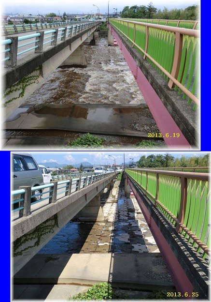 私が毎日の様に歩く松川土手コースは川寒橋を渡って土手を歩き、上松川橋の下をくぐってその先にある人と自転車しか渡れない橋を渡り再び対岸の土手を歩いて飯坂街道にかかる上松川橋まで戻ります今日も同じこのコースを歩いて来ました 昨日の事ですが、最後の橋を渡り終えて下(7日の日記登場の黒ラブちゃんとは逆側)を見ましたらこんどは雉のつがいがいたのです最初はメスで、その後からオスが追いかける様に歩いていました先日の青大将(5/31日記)には驚かされましたがこの土手って、毎回色んな事に出会えるので本当に楽しいです今まで気づきませんでしたがこの橋にも名前がありました、それも「あほはら橋」面白い名前ですね~、どうしてこんな名前がつけられたのでしょうね 今日、このあほはら橋から見た松川ですがこんなに水が少なくなっていてこのままでは川が干上がってしまうのではと心配です 心配と云えば、我が家のやんちゃ坊主の茶々丸くん勝手口のしきりをずらすコツを覚えたみたいで気が付けば今日の午後も外に脱走してました (゚ロ゚;) 暫く放っておきましたら物置の前で寝そべっていたので猫缶のフタを開けて見せましたら案の定家の中に入って来て、そこでご用となりました~(=^・・^)ヾ(^^ )しきりが動かない様に物を置いておいたのですが何も知らない夫が帰って来てそれをどかした為茶々丸は再び外へと出かけてしまいました、夜遊びに。。