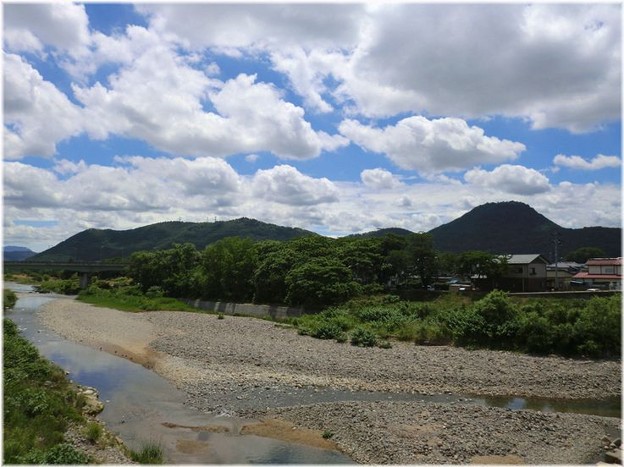 毎日暑い日が続いていますすでに梅雨入りした地域もあるというのにこちらは全然雨が降りません昨日のウォーキングでは川寒橋を渡らずに手前の松川土手を歩く事にしました2ヶ月前は、まだ白鳥がいた所です 雨が降らない為、川の水かさが減り川原がとても広くなっていますそして普段なら上の部分しか見えない(今では使われていない)渡り石が姿を現していたのでそこを渡って行く事にしました2通りの中からどちらを行くか選択です見た目左の方が楽そうなのでそちらを歩く事にしましたいくつ目か進んだ時、川上の石の上に1羽の鴨を発見 (^^)♪今もいるという事はカルガモでしょうか???松川の水ってこんなに綺麗なのに魚が何故いないのでしょうか?今まで釣り人を見かけた事が無いのです 向こうに見える橋が、飯坂電車が通る上松川橋でその下で時々あの黒ちゃんを見かけるのです 楽しそうに思えた石渡りでしたが間隔は2~30cm位、たった1ヶ所40cm以上の所があってそこだけは迷いながら必死で飛びました振り返ってみますとそれほど対した事ではないのに自分の中ではちょっとした運動をしてきた様でなんかちょっとウキウキ気分~♪昨日は黒ちゃんに会えなかったけどドライフードだけ置いて来ました・・・食べてくれたかな~ 。。。(^‥^=)~ 上松川橋下をくぐり、土手へ上がって更に西へと歩き橋を渡ろうと道路の方を見ましたら木陰のベンチでふたりのおばあさんが休んでいました昨日も暑かったけれど、どうやら今日も暑くなりそうです