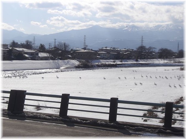 久々に松川方面へ向かって歩いてきました川寒橋まで来て川を見て驚いたのですが80羽近くいた白鳥が、数羽しか泳いでいなかったのです白鳥は?と探してみますと河原から、私が歩いていた道の上にまで来ていて写真では分かりづらいと思いますが枯れ草のある辺りに多く集まっていたのです雪が深くて近くまで誰も行けない為餌を求めての行動だったのでしょうか?結局私も松川の方へは下りて行く事が出来ずそのまま歩き続け、交差点から飯坂街道へ向かう道へと曲がり更に途中から住宅地の中の道を歩いて行きました兎に角吾妻山に向かって歩けば間違いありませんそうして歩き続けていましたら、県営住宅の所に出たのですがここら辺りは良く知っている場所でして飯坂街道はもうこのすぐ先です上松川駅を横に見ながら踏切を渡って飯坂街道へ出てあとは家に向かって帰って来たわけですが上松川橋を渡りながら、橋下の黒ちゃんはどうしているかとふと気になったのでした 松川沿いの道の雪が溶けるまでは当分このコースを歩く事になりそうです明日はカリカリを持って来てみようかな~