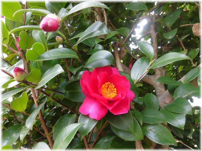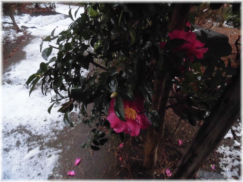 玄関前に咲いている山茶花の花 植えてからすでに30年になろうとしている今になって夫との間でちょっとした論争が勃発していました 急に夫があれは山茶花じゃなくて椿だと云い始めたのです確かに花も葉も椿に似ていますが植えてくれた夫の友人からは山茶花と聞いていたので私も負けずにこれは絶対山茶花だと..そしてネットで調べてみましたらはっきり違いが分かるのが花の散り方で椿は花ごと落ちるのに対し、山茶花は花びらが散って落ちるそう書かれていたのです・・・そして見てみるとやっぱり我が家に咲いているのは山茶花だったのです夫に言いますと「あぁ、そうなの」とたった一言でしたでも、嬉しい発見も そうなんです、山茶花の下にあるクリスマスローズに可愛い蕾を発見したのでした