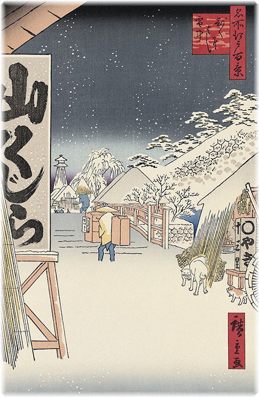 NHKを点けたら「浮世絵EDO-LIFE」をやっていて 面白そうなので見てしまいましたこの日は安藤広重の浮世絵「びくにばし雪中」を通してなかなか面白い話をしてくれたのです 場所は現在の京橋、有楽町近くだそうで江戸城の石垣なども描かれています面白いと思ったのは、「山くじら」と「十三里」で山くじらは猪の肉で当時四足を食する事は禁じられていてつけられた名前そうです「○やき十三里」と書かれた向かいの看板は焼き芋の事でさつま芋の産地川越が江戸から十三里の場所にあったことからと栗 (九里)より(四里)美味いさつま芋という意味があったそうです