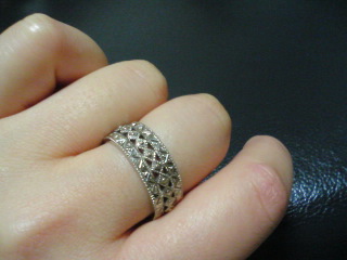 毎日だらけていたら4連休のうち3日も過ぎてしまいました。恐ろしい。とりあえず質問をうけたわかたけさんのリングNO.0525と私のエメラルドリングのベースNO.0859の違いについて説明してみます。NO.0859わかりやすいよう石がない側を写してみました。NO.0859はメレダイヤの入らない地金のみのフルエタニティのリングです。このためNO.0859は一周全部厚みのあるつくりになっています。シャカ玉のある一番厚みのある部分は1.5mm以上あるんじゃないかなぁ。(定規で測りました・・・こういう時こそノギスで測れって感じですよね)重さも結構あります。といっても計らないのでグラム数までは知りませんが。なお私のリングにダイヤが入っているのは追加したからです。通常は入りません。ご注意。エドワーディアン手彫りリングホワイトゴールド0070k18wgNo.0525なんですが商品名がNO.0070になってますね・・・orz(あえてそのまま載せてみました)拡大写真を見ていただければわかりますが手のひら側に菱型の模様はありません。上下の彫りはあります。また手のひら側が若干薄いつくりになっています。一概にどちらがいいかは言えませんが厚みがあるリングが苦手な人やもともとダイヤが入っている方がいい人はNo.0525の方がいいですね。石座の彫り・・・わかるかな?石座は別作です。ありものではないので型番はありません。最初は爪で行くつもりだったんですが色々と考えてぎざぎざのふせこみに変えました。爪よりもカンティーユらしいし他のお店ではあまりないデザインなのでこの形に変えてよかったかなと思います。なおこの写真だと全くわかりませんが裏はハート籠になっています。パライバと違うのはぎざぎざにふせてある下の部分、石の横の部分に若干高さがありこの部分にもリングの上下に施されている彫と同じ彫りが施されていることかな。よく見ないとわかりませんが好きなポイントです。ということで(いつかわかりませんが)その2に続きます。