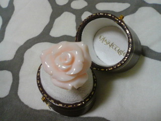 「多分アレだろうなー」と思ってたものがあったんですがやっぱりアレでした。 新しい形のローズリーフ&フラワー 実はローズリーフのちっこいPTが欲しいと思ってコーイに伺った時に見せてもらったのがこのシリーズのローズリーフ&フラワーなんですよ。プチっていうより大きいでしょでしょ?あと花がローズっていうよりロータスに見えたのでなんとなく違うかなと。で 別のものにしたのですが・・・製品になってると結構いいですね(現金)。このつるっとした感じがでも新しいローズリーフの形よりやっぱり昔の形の方が好きです。明日はカンティーユ@池袋のクラフツショー最終日に行ってきます。午後の遅い時間にふらふらする予定です。エメラルドのリングのことでちょっと謎があって職人さんに確認したいことがあるんですが善臣さん(彫りの職人さんです)じゃないかもしれないけどとりあえず。ところでもう売れちゃいましたがコーイの花籠リング。 リボンの形がすごく好き「これ腕は和彫りだよね・・・」って思ってたらその通りで。 →参考:maruchobiさんちのカンティーユの実演ではもちろんカンティーユの商品に使われている彫りを中心にやっているんですがそれ以外の彫りも見せてくれることが多くて前回の銀座では月桂樹の彫りや桜彫りを見ることが出来ました。お暇な方は是非池袋へ足を運んでみてください。まあ健二さん(造りの職人さん)だと彫りの実演ではないんですが・・・。ミャンマー・サイクロン災害救援金についての日記