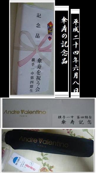 逢えば楽しく、別れは寂しく今帰りました。321人の同期性・女43人・男34名の参加遠くは北海道・名古屋と参加をしてくれました。模様は明日にでも・・・。ただ土産が付きました。何とも考えますね。【傘】傘寿に合わせて人が沢山集まれと言わんばかりの文字に合わせての傘・・・。 楽しさも家に帰ると疲れがどっと、それでも記念写真を眺めながらあれこれと想いを巡らせながら