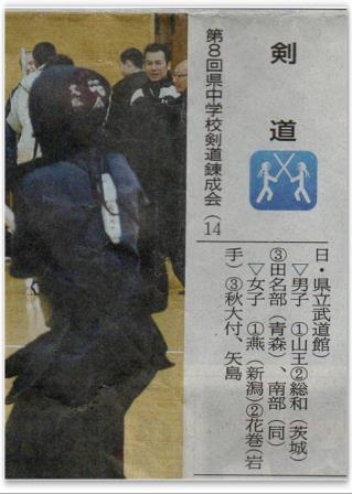 先日の13・14日の第8回県中学校剣道錬成会の模様が新聞に載ってたので早速載せてしまうバーさん。孫が沖縄から今日帰る予定ですがこの台風ではと心此処に非ずですね。剣道の事は載せるなと言われておりますが、孫と食べ物の私のブログどうしようもありません。その内変えなければと思いますが、まだ中学生と・・・。全県から九州と四国からは来なかったようですが、13日のリーグ戦・14日のトーナメント優勝したことが今朝の新聞に載っておりました。ビデでは模様を見ておりますが、これに九州の選手が加わると大変だねと話し合ったばかりでした。 昨日からの天気の大荒れ6時頃から少しは落ち着いてきましたので安堵してると今また音をして荒れてきました。息子は今日は何処へも出ない事と念を押されましたが、何故か今日はPC教室今年度最後です。昨晩からプリントの復習・教えてて分からないと言われない ようにしかと目を通す。主にネットから文章にスプリンショットで地図を取り入れる方法を入れたプリントを作成其れが出来るともう一枚を作成・・・行ってきますどうにか今年のPCサークルも終わりました。教室の窓からのぞくとあの雪は何処へと言うほど雪は解けて雨雪が降っております。