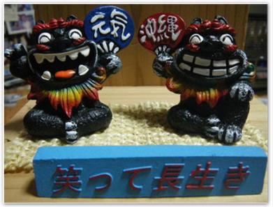 穏やかな天気になりました。此方は余り被害には合わないようでしたが、他県の被害をニュースで見てるとこの寒いのにとお見舞い申し上げたくなります。孫も無事に帰りました。時間的には遅れたようでしたが夜11時家に到着余りつかれた様子もなく、早速下さる土産には笑いました。手向けながらまだまだお迎えは出来ないようですねっと云ってね。それが、シーサーの置き物【笑て長生き】とのネームを…思ってくれてるんだと涙しました。これをを載せながらカセットでは沖縄民謡の【芭蕉布】を聞きながら・・・ 外孫にも忘れないで・家のはシーサーの置き物そこでしか求められないものばかりでした。食べ物もそれぞれ家族が好きそうなものばかりを、大孫の分まで開けられないそうです。 お土産で一杯のカバンを重そうにおろす孫、いつも練習練習で遊ぶことのない孫・この時とばかりにと 求めたでしょう。今朝出かけに稽古のバックを重そうに下げながら行ってきますと車へ手を振る私に手を振ってくれる。ちんすこうも変わりましたね、塩と言って茶色ではなくなって白い色に変わっておりました。コーヒーを淹れながらいただきました。 ウン美味しい美味しい今日は誰も来てくれません。