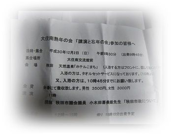 12月らしくない今年の冬、今日は【熟年の会講演】と忘年会がありました。場所はいつも行くこまち温泉、バスで10分足らずのところです。参加者が一番多い年で43名でした。和やかに過ごしてきましたが、帰るなり息子に良い知らせがあったようで今晩外食とのことでしたが、4時近くに帰って一休みをしてる所へ帰ってくるなり行ってきました。写真は明日にでも・・・息子のところは写真は撮れませんでしたが、三人で嬉しさを胸に食事をしてきました。まだ明かせませんがねそのうちですよ。
