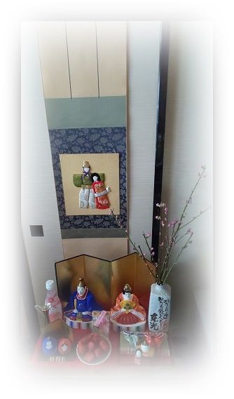 また寒さがぶり返してきました。外は風の音がします。ボウリングの友出掛けたでしょう???自分は内裏雛を出して飾りつけをしました。昨日丁度良く梅の花を買ってたので飾り付けに有難かったですよ。香合の立雛も出してあげました。なんのことはない自分で作った押絵の額もそして絵の具で描いた額も出しました。上手とは言えないがあの当時は何にでも挑戦したことを想いだしながら・・・。外は寒いし今日はボウリングの友のお誘いはないでしょうっと。