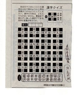 今朝は予報通り寒気が戻ったようです。散歩どころか道路が凍って歩きにくいようです。こんな時にはとゆっくりと新聞を読んでるとなんと漢字のクイズが載っております。PCをやりだしてからは漢字も読むことはできますが書くとなると全然おぼつかなくなってきました。常に思っているのですがね。早速、鉛筆を持ち出す。最初は中々みつけることがね???。一つを見つけると何とか・明日の新聞に答えが載りそうです。今日は明日の日の振替で介護体操に行ってきます。又変わった人と一緒になると何となくね~~~。でも頑張ってきます。外は寒いですがね。
