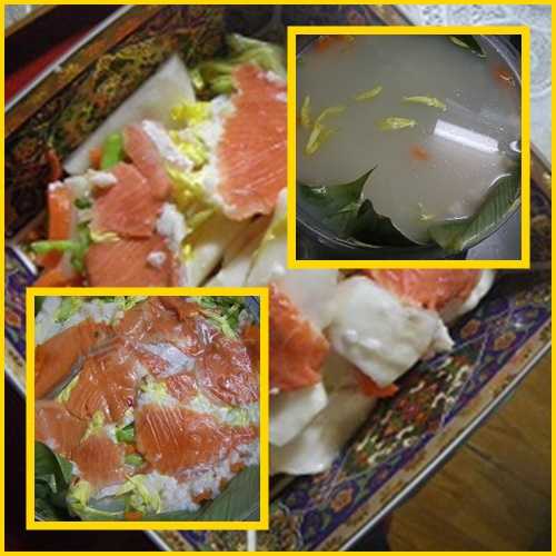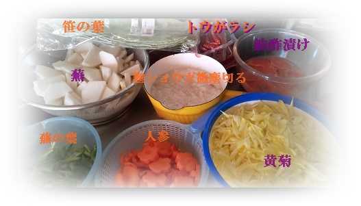 一日中寒い日でした。24日から寒気が出るとか本当に寒くなるのかなと何となく一日中鮭寿司作りとテレビで過ごす。上手く出来るかと不安もあるが何時も材料は目分量・・・。でもまづは材料を載せました。作り方笹の葉・蕪・人参・人参の葉・菊・唐辛子と重ねていく最後は麹をばらまきその上に酢につけておいた鮭を載せる之を繰り返して重石を載せておくだけです。蕪はすぐに食べれるので夕飯にでも食べれそうですがね。もう相撲が始まっていますよ。どうなるかしらと・・・。貴景勝が勝ちました。貫録のある話に涙しましたよ。明日の朝は鮭の飯寿司が食べれそうです。
