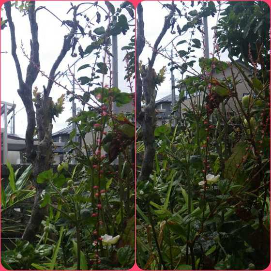 どんよりとした空ですまた雨かな変ね気候よね。一雨ごとにと言われていますが寒さがね。夕べも雨が降ったのかね地面が濡れています。赤の水引がめだって咲いています。今年は金水引も白も見当たらないのよね。映すのが下手なのにどうにか赤は写せましたよ。白のシュウメイ菊が一輪咲いて見えますがまだ蕾が一杯なのよね。息子が出がけに何をしてると言ってね・・・何時もの事なのにとまだ写したいがひと間づ家に入り。ドクダビの小さいのが目立ってきましたよ。
