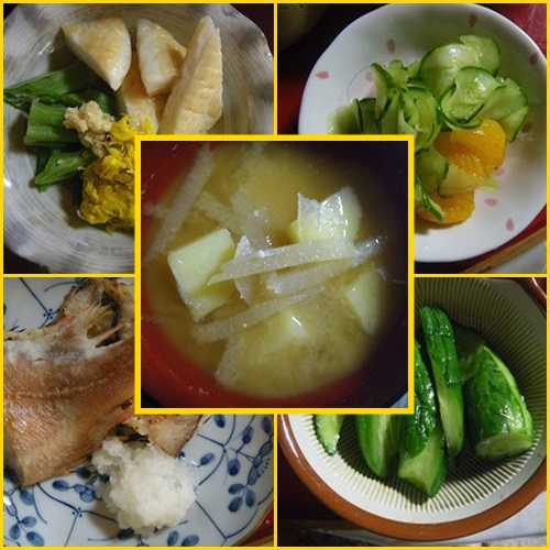 ようやく秋らしく涼しさを感じたと思ってるともう関東方面には台風13号の到来雨のようです。此方は陽が射してても秋風が心地いいのにと。今朝は昨日頂いたアサツマイモ御飯を焚きました。又も大根とジャガイモの味噌汁もね。今日の大根は銀杏切りに・・・。きゅうりもみもサクサクと噛み心地いいのよね。と言ってると今日は又も午後から介護機能維持だった昨日の日替わりでね。夕べ電話があって迎えが1時半頃との事でしたが・・・今朝の電話で1時に変更と。昨日の疲れも取れたのにまたと思うが其れも行かないと運動はゼロだしと・・・。先ずは言って来ます。