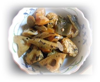 レンコンの煮つけを出しました。和洋折衷ってとこでしょうね。大笑い