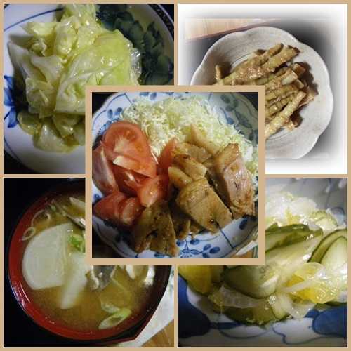 ​豚肉の味噌漬け・缶詰のタケノコのこ味噌煮・キャベツのコールースロー・