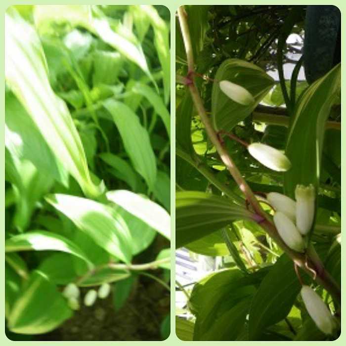 斑入りのナルコユリは秋田蕗の下になって横に咲いていました