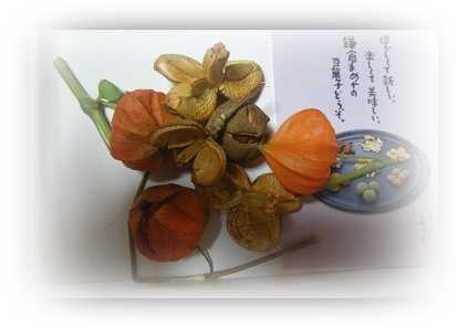 先日の椿の殻にほうずきもまだ赤く咲いてるので足しました。