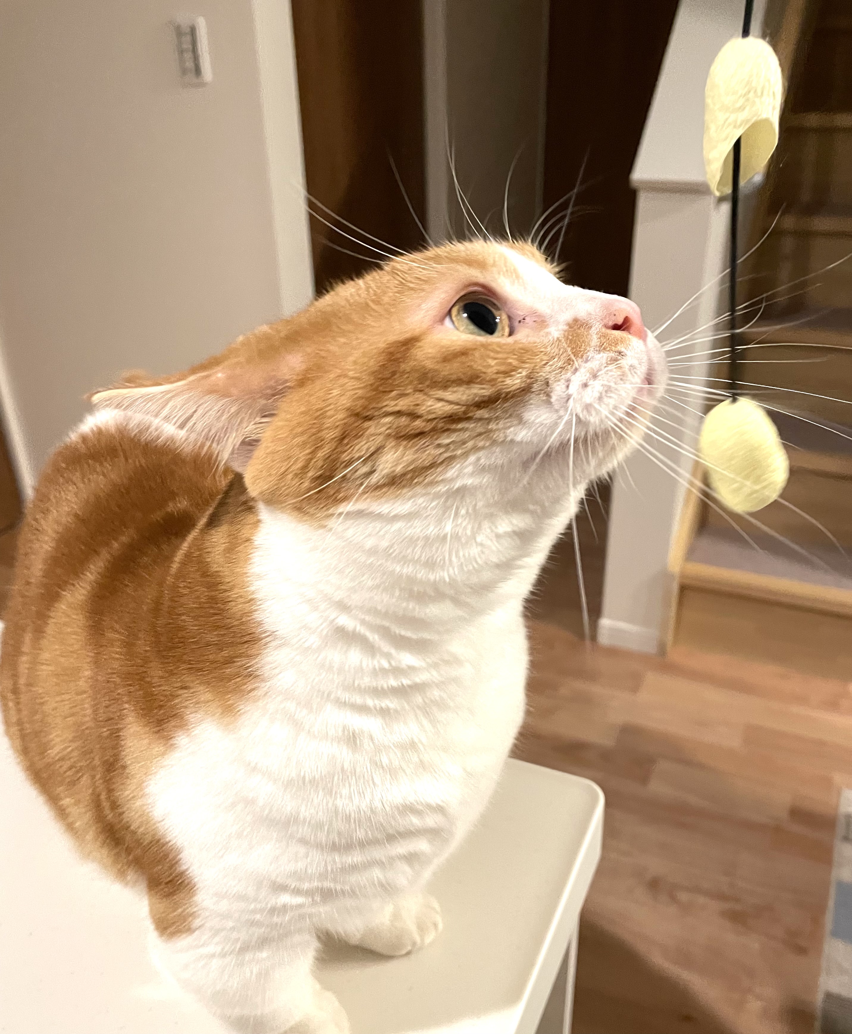 猫ちゃん用の白いまゆがついたおもちゃを見て
