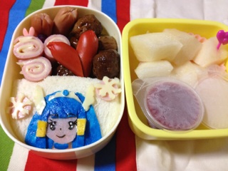 こんにちは 今日はほーちゃんの幼稚園のお弁当日でした ほーちゃんは前々から『ピース(プリキュアの)作って~』 って言ってました なぜ、ビューティーではなくピース??って思う方もいてるかもしれませんが、前にビューティー1回作ったんですが撃沈しました そんなビューティーはコレ お恥ずかしい やっぱり無理だ~!!! でも、ほーちゃんは今度はピースって言うしやるだけやってみた 今の私の限界はこんなもんです スマイルプリキュアのキュアピースのお弁当 恥ずかしながらちょっとアップで ピース(薄焼き玉子、ハム、チーズ、人参、海苔)ピースの下はサンドイッチミートボール、人参、ウインナー、ハムチーズゼリー、お団子 正直やっぱり顔がめちゃめちゃ難しかったです朝はゆうちゃんも起きてしまいそうだったので、ピースの部分だけ昨晩頑張って作りました ちょっと違うけどほーちゃんは喜んでくれたし良かった~~!! 後は幼稚園のお昼まで崩れてなかったらいいなぁ ちゃんとしたプリキュアはこんなんです