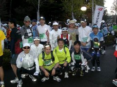 2度目のサブ10は達成ならず。微妙なアップダウンの連続と、吹き荒れる強風に降参です。10時間06分33秒、42位でした。前半50km:4時間51分後半50km:5時間15分ビルドアップするどころか、失速。2月以降、平坦コースしか走って来なかったツケが出ました。では、簡単な完走記です。新たに写真を戴いたので、追加掲載します。(私が写っているものは、トゥルースさん&ネガポチさん提供) 楽天ランナーが揃いましたが、ほんの一部です。AM5時、100kmの部スタート。序盤は下り基調だったので、意識的にペースを抑える。それでも、20km地点を1時間51分くらいで通過(ちょっと速いかも)。山中湖に入る手前で、素浪人さんを捕獲。30km過ぎの信号からは、コバティーさんを追いかけるような展開に。他に、わにわにさんと岩本里奈さんをターゲットにする。 40km地点を3時間45分で通過。笑石人さん、ひろみさん、クリさんの応援を受ける。大会エイドの隣りに、かおちゃん&雲助さんの私設エイドが。挨拶して、おにぎりとコーラをいただく。河口湖からは、向かい風がキツイ。あまりにも強い風に、帽子を押さえながら歩くことも。とてもキロ6分を維持できず、次第に貯金が減ってゆく・・・。65km地点からは、折り返し区間。ご近所の楽天ランナーでは、たくろうさんがトップで戻ってきました。続いてマシュさん、コバティーさん。本栖湖駐車場の手前で、再び笑石人さんたちの応援を受ける。(リタイヤした素浪人さんも、応援組に合流していた)折り返しポイントで、ペターさんと会う。折り返し区間の復路でクローチェさん、いわすさん、ポジパパさんと会う。 70km地点を7時間ギリギリで通過。昨年までなら、最後の30kmはペースアップするのですが・・・既に脚が終わっています。83.6km地点の西浜小学校エイド。コバティーさんとマシュさんが潰れてしまい、休憩されていた。90km地点を9時間01分で通過。サブテンの可能性を残していたが、どうやら表示が怪しい模様。92.5km地点の到着が9時間20分だったし。ここからは、4kmもの長~い上り。歩くことはないけど、キロ7分以上かかっています。ようやく、競技場へ戻ってきました。と、貧血症状が出てきて、視界が暗くなってきました。慎重にトラックを一周して、ゆっくりゴールテープを切ります。テントでヴァームゼリーを受け取ったら、そこでダウン。邪魔にならない場所まで3mほど転がりながら、そこで寝込みます。 このまま、ゴール後は30分も起き上がれず。コバティーさん、マシュさんのゴールは寝たまま見届けました。お互いのシューズチェックをする4人。楽天のサブテン6人衆は、揃って撃沈。たくろうさんが、初めてのサブテンを達成されました。ゆうちゃんは、終盤に(?)いわすさんを拾ってきたとか。競技場前の花道では、再び楽天ランナーが集結。時計を見ては、まだ戻って来ない仲間を思って落ち着かず。ラルム♪さん、うるとらyouさんの帰還には感動しました。ラルム♪さんのゴール。富士山をバックに記念写真(ラルム♪さん、ゆうちゃん)。