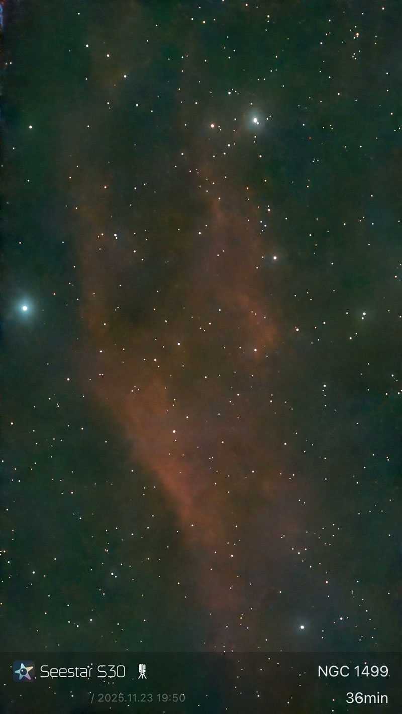 ↑今回は赤い星雲がS30の視野いっぱいに写せるカリフォルニア星雲というものを写してみました。