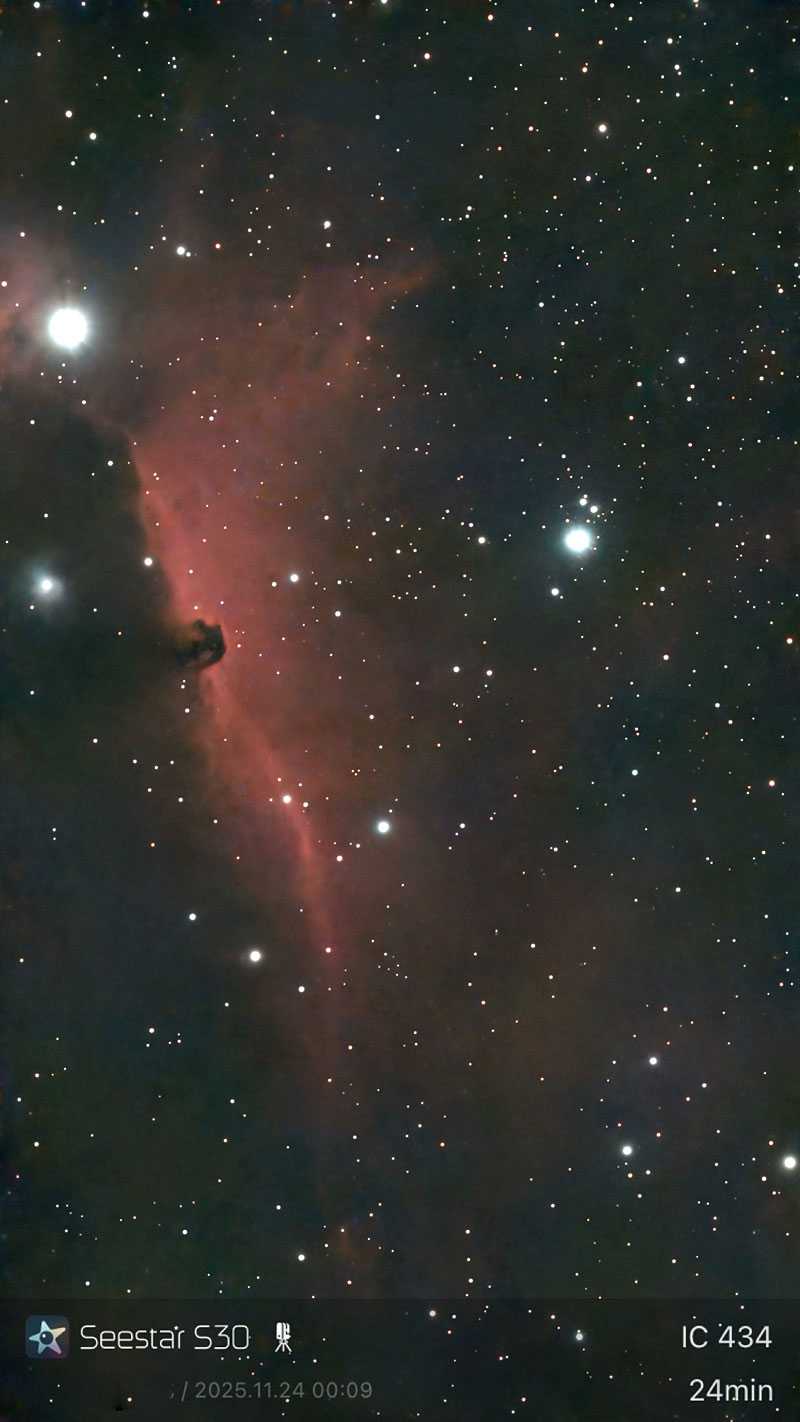 まずはオリオン座にある馬頭星雲。今回は特徴的な馬の頭のように見える部分の上部(写真では右側)に広がっている淡い星雲も写すために手動で位置補正しています。
