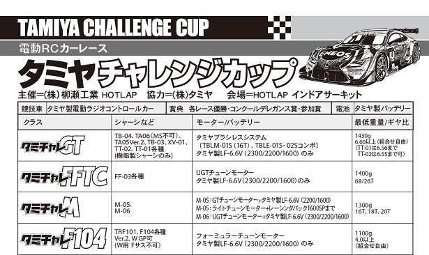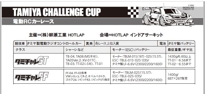 こんにちはー HOTLAPですー昨日 24日 金曜日から いつもの アスファルトコース に戻っておりますーグリップも 上々 三か月半 猛暑を防いだ路面は ステキな テカテカ加減ですHOTLAPオリジナル 路面散布専用グリップ剤 HL101 も 大量に散布ねちゃねちゃです(^o^)丿楽しいよー よろしくねそして 明日 10月26日 日曜日は 全国統一タミチャレがありますー10時前には PIT入れますよー スタートは 1時半くらい いつもの 5つのカテゴリー当日エントリーも もちろんOKタミヤさんから 豪華景品 届いていますよー(^v^)よろしくね お待ちしておりますー