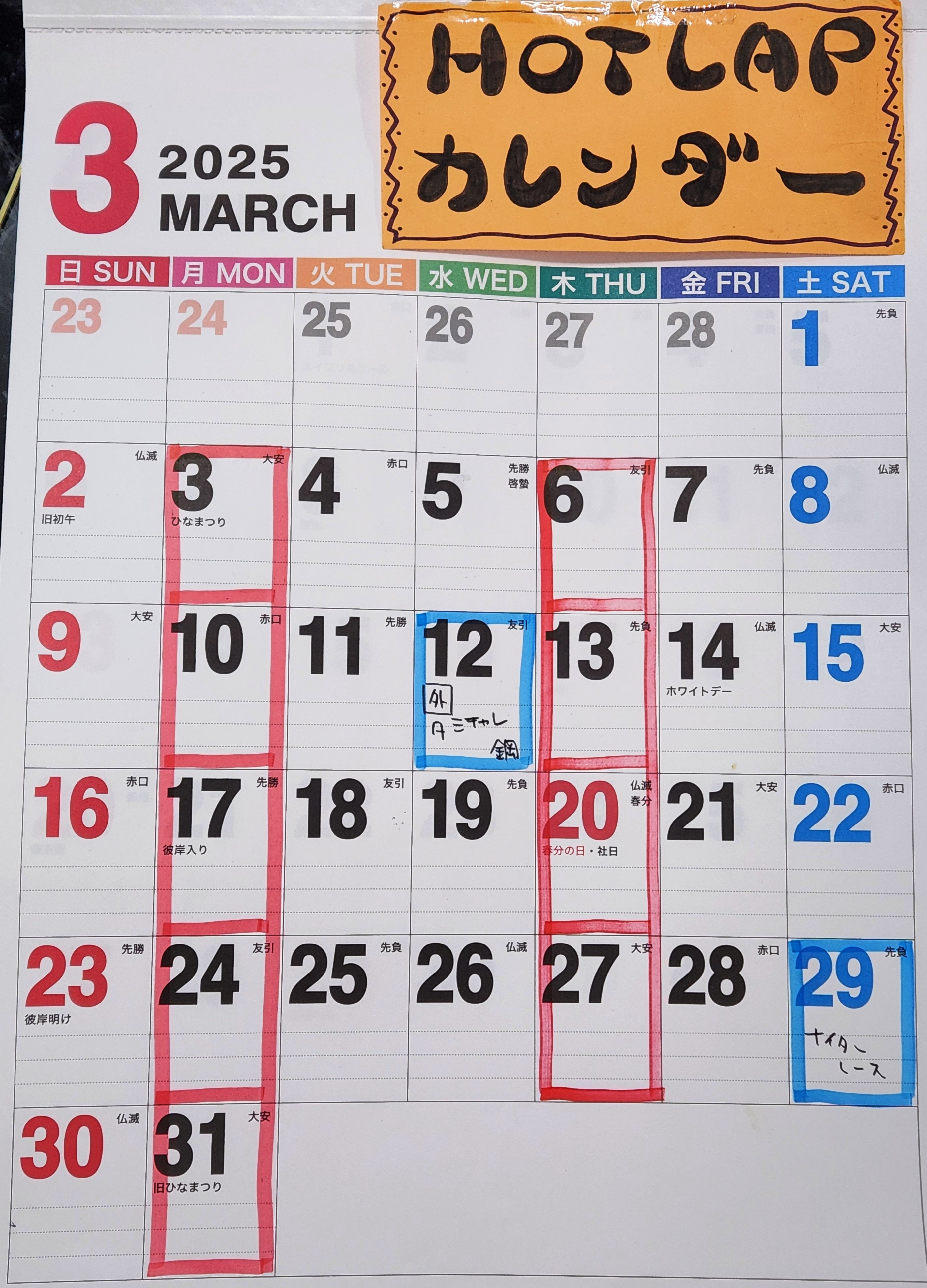 こんばんは HOTLAPです3月のカレンダー こんな感じで お願いします12日(水) 鋼タミチャレがございます 晴れるといいなカテゴリーは GT ラリー 今年からのMラリー でございますよろしくね29日(土)ナイターレースがございます カテゴリーはYOSHIYAMA ノンブー フレッシュマン リフェ サンパチ1 の5つ予定3月もよろしくです('ω')