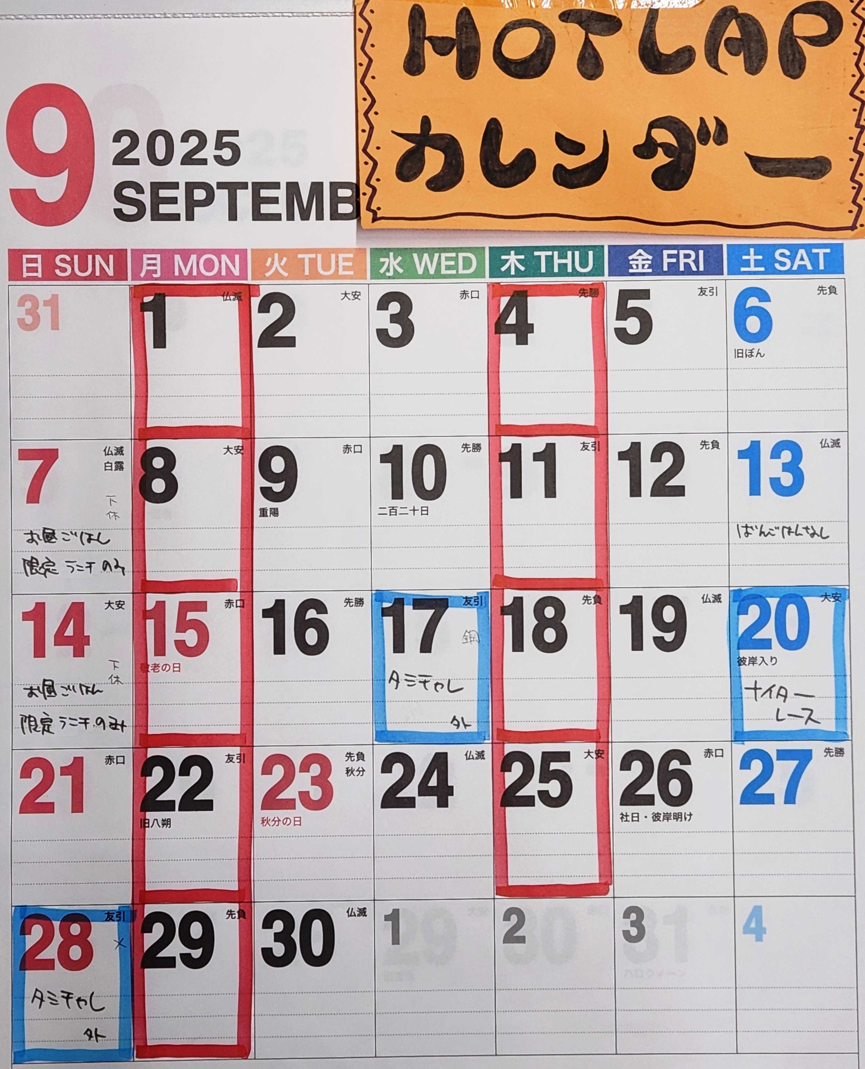 こんばんは HOTLAPですすごい暑さですが 9月の予定カレンダー 見てくださいね(^_-)-☆7日(日) と14日(日) 下の食堂のみお休みで 2階でランチのみ提供させていただきます(味噌カツサンドとその他もろもろプレート)すいません よろしくです<(_ _)>17日(水) 多分 暑っいでしょうが タミチャレがございます (鋼枠)外コースです カテゴリーは Mラリー GT ラリーの3つ暑そうですので ピットオープン8時 でいきます 雨天時は考えますレース終了で 営業も終了とさせていただきます お気軽にご参加よろしくです20日(土)ナイターレースがございます カテゴリーはあつ森 サンパチA ノンブー フレッシュマン リフェクラス YOSHIYAMAですよろしくね28日(日) タミチャレがございます 外コースです (鋼枠)カテゴリーは4つ GT Mラリー ラリー KIMI の4つ雨降りそうなときは 考えますお気軽にご参加よろしくねでは 9月たのしみましょうー (涼しくなってー((+_+)))