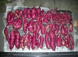 今日はなんだか降りそうな天気。午前中、降ってしまった。明日、同じマンションのコウちゃんちに「お呼ばれ」されているので、母ちゃんは自作の芋で、スイートポテトを作って持って行こうっておもってたんだけど、雨かー。 夕方止んでいたので、畑へ出かけた。4時半。1時間掘って、だんだん暗くて見えなくなってきた。 母ちゃんが土を掘ると芋が出る。ボクは「おイモさん、発見!」と拾い上げる。引っ張っても抜けないのは、母ちゃんにお願いした。(ほとんど母ちゃんが掘ったけど) とりあえず掘り散らかして、全部取ったみたいだったので帰った。ベランダで芋洗い。うんちく「芋の子洗い」と言う言葉の、芋は里芋を指すらしい。でも、里芋を収穫した時は洗ってなかったなー、母ちゃん×サツマイモの皮って、手でこすっただけでも剥けちゃうのね、慎重に洗ったよ。 レジ袋Lサイズで2袋分はあるのかな?大収穫!今日は父ちゃんが呑みで遅くなるから、洗ったあと、一番大きいのと3番目に大きいので1.2Kgを使い、母ちゃんは菓子作りの下準備を始めた。 サツマイモのペーストと、スイートポテトのためのふかし芋を作った。皮は全部ウサギが食べたよ。幸も女の子だね、サツマイモ、大好きなんだ。サツマイモのペーストは、白玉で包んでペッタンコにして、フライパンの弱火で10分。梅が枝餅のサツマイモ餡って感じになって美味い。「梅が枝餅」とは、太宰府天満宮の参道で超有名な土産物母ちゃんのウサギサイト