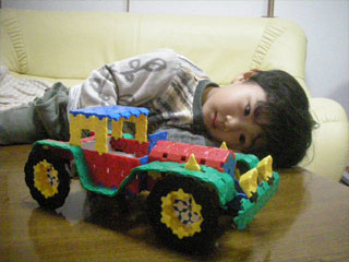 今日は父ちゃんが呑みでご飯がいらないし、畑に生ゴミを埋めるくらいしか、することがない母ちゃんは、朝からのんびりしていた。 LAQで簡単な作品を3つほど作ってくれたり、幸ちゃんと遊んだり。 母ちゃんがのんびりしているとボクものんびりするので、今日はキッズ服のリサイクルショップにいった。月曜日に値段がわからなくて、取り置きしてもらっていたボクのスーツの値段をきいて購入、¥1800。¥2500で茶色のコートを買った。 爺の家に行ったけどヤエ婆が居ない。歯医者で不在。ボクはついていないコタツにもぐり、「逆転イッパツマン」の1・2話を見た。アツ婆んちにもタイムボカンシリーズが6巻、爺婆んちにもおなじく6巻、ビデオが置いてある。なんでだ? 帰りの自転車でボクは眠った。母ちゃんがのんびり過ごすとボクものんびりして眠くなる。母ちゃんのウサギサイト (母ちゃん記)数ヶ月前、タイムボカンシリーズいろいろで12巻のビデオがレンタル落ちで¥980で売ってあったのをTSUTAYAで購入。AKITOは買うなと嫌がったが「母ちゃんがほしいんだ」と分けのわかない口論を店内でしたあと、強引に購入し、半分ずつをビデオ本体のあるお宅に置いてきた。ちなみにうちではビデオをみることはできません。本体がないからね。