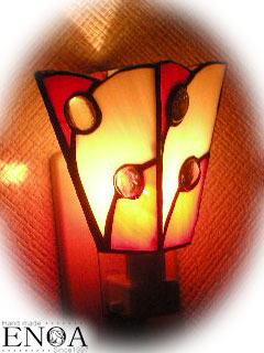 ◆製作日:2008年5月6日~2008年5月9日◆サイズ:高さ10cm × 上辺8cm・底辺4cm 4面◆ステンドグラス2作品目:尚江オリジナル5/6:デザイン&型紙作り・・・約3時間5/7:ガラスカット・・・約3時間5/8:コパーテープ半分・・・40分5/9:残りの作業→完成・・・3時間半 下手なので、直線が直線ではないため、角の部分にすごいデッカイ穴が開きまくった。コパーテープを半田の上から貼って穴をふさぎ、半田を持って埋めたのだけど、コレってNGですよね・・・ そして立体初挑戦だったんだけど、なんとかなった。 2作品目は、カメだのオカメインコだの、三角行灯だのと言っていたが、前回より40日ほどあいたため、作業工程に一抹の不安があったのと、三角行灯の照明器具が¥2980するので、照明部分が¥750のナイトランプでランプの練習をすることにした。 人様のデザインで作るつもりが、師匠のナイトランプ数点を拝見するうち、照明の注文の時より、やってみたかったことにもチャレンジしたくなり、結果的に自分でデザインする。 それは、おはじきみたいなの(パールナギット)を埋めるように使うこと。息子のおはじきに買っていたのが大量にあり上の丸いのに使う。下の紫の丸いのは今回購入した分。で、今回も大失敗。半田付けの時にガラスにヒビが入った。すでにくっついているので、割れたり壊れたりはしないけど、1本2本ではない。パネルの時はそんなことなかったのになー。温度が高すぎたかなー。ガラスが割れたら、これって本当なら、没ですよね。まぁ、いいさ。練習練習。相変わらず半田もテープ巻きも、というよりすべての作業において下手なのだけど、前回よりも気持ちに余裕があり「試行錯誤する」ことができた。 私よりも2作品目を心待ちにされていた師匠!できましたよー!! 名誉の負傷:今回はガジガジのしすぎで右手薬指に水ぶくれ1つ。母ちゃんのウサギサイト午前中、畑に行って、きゅうりの苗のために格子状の添え木も作ったよ。