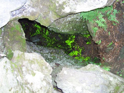 洞窟の入り口から奥にかけて、緑色にやや明るく輝いて見えるのが「光苔」。