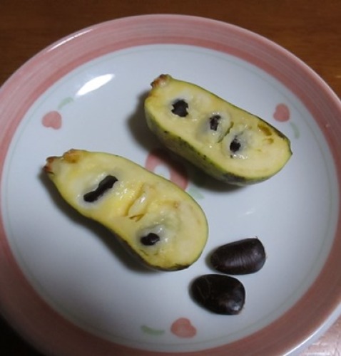 おはようございます!今日は台風が遠ざかったので快晴暑くなりそうです洗濯物もすぐ乾いてくれますね。昨日は絵の先生のお宅で面白い果実をいただいてきました。「ポポウ」とかいうのだそうですが私は初めて見たし食べました。家族用に1ついただいてきたのですが切る前のものを撮っておき忘れました半分に切ったものがこれです。これは6cmくらいの大きさです。お味の方はちょっと洋ナシのようでこってりしています。ただ種が大きいので食べる部分はちょっと少ないかも。でも美味しくて気に入りました!!この種をまけばどんどん生えるそうです。生命力が強いそうなので手入れ無しで大丈夫とのこと。そういうの大好きです家人は以前食べたことがあるそうです。植えることに賛成してくれました。息子も美味しいと言っていたので早く大きくなって実がなってくれると嬉しいなと蒔かぬ前からワクワクしてます昨日司法書士さんのお宅にお金を持っていく前に夕飯の買い物をしようとスーパーに寄りましたら高校の役員仲間のママさんに会いました。誰かのママさんに「集りはないの?」と聞かれたけれど・・・と言いますので来週の公開授業で来たお母さんに我が家でお茶会をしようかなと思っていると呼びかけようということになりました。何か食べ物を1品持ち寄りで。結構皆さん集まりたいと思っているんですよね。でも私が忙しかったのでなかなかそこまで余裕がなくて・・・って他にも役員は2人いるのですからちょっと行動してと思わなくはないのですが。やっぱり私が動かないとダメなんですね頑張って計画いたしましょう。さあでは今日も頑張りましょう!応援ポチよろしかったらお願いいたします。(1人1日1回有効です)