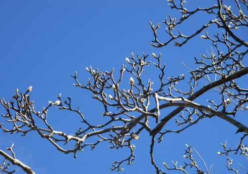庭のハクモクレンのつぼみがちらほらと見えるようになりました。